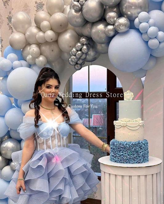 Qanz Short Sky Blue Homecoming Dresses Above Knee/Mini Shiny Tulle Vestidos De