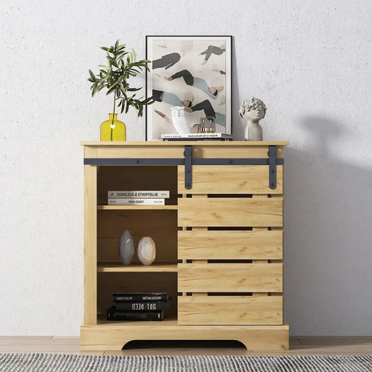 USA Essentials Coffee Bar Table with Sliding Barn Door, Kitchen Cabinet with Interior