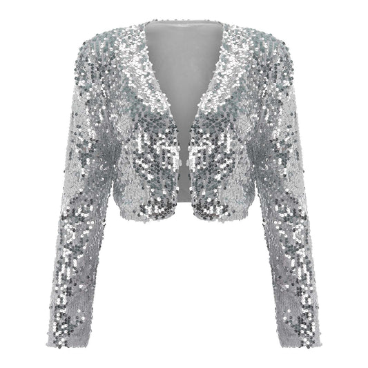 Women Coat Shining Sequined Long Sleeve Cropped Length Open Front Bolero Shrug
