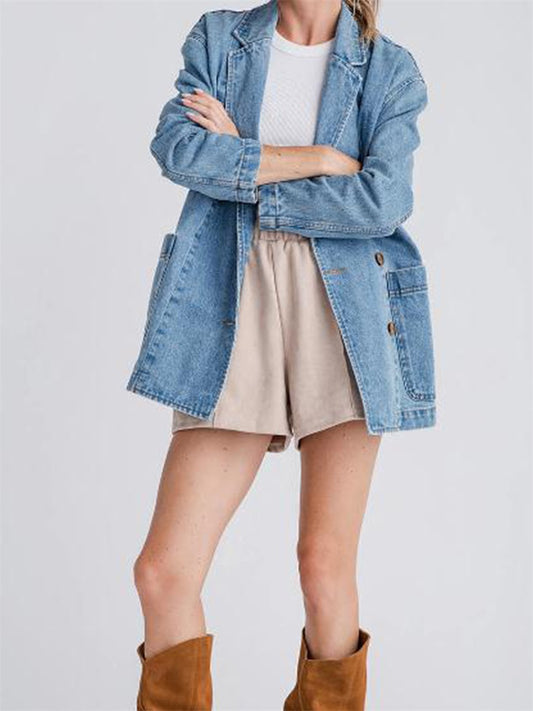Women s Denim Blazer Stylish Long Sleeve Lapel Collar Button Closure Jacket wit