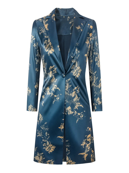 Women's Fashionable Casual Elegant Golden Twilight Navy and Gold Floral Satin Overcoat Trench Coat