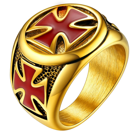 U7 Stainless Steel Round Knight Templar Rings Red Glaze Cross The Temple of Solomo Crusader Cross Man Signet Ring Jewelry Gift