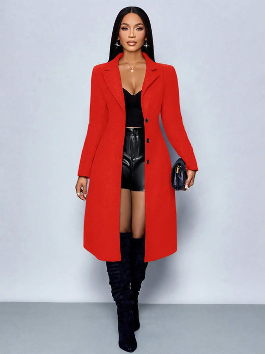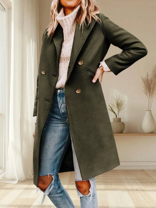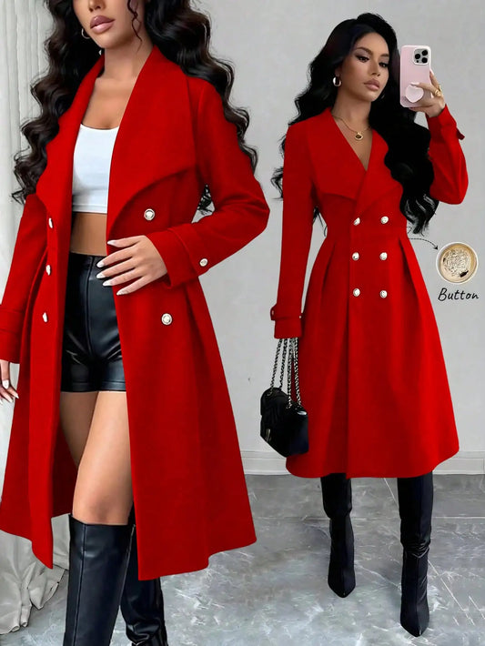 Elenzya Women's Burgundy Double-Breasted Wool Blend Coat, Elegant Street & Business Wear for Autumn Winter