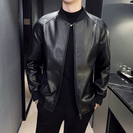 Men's PU Leather Jacket Fashion Baseball Collar Casual Jackets Solid Color Mot