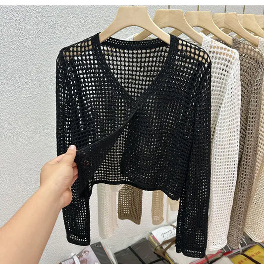 Hollow Mesh Ice Silk Sunscreen Jacket for Women's Summer Long Sleeved Outerwear with Small Shawl Knitted Cardigan