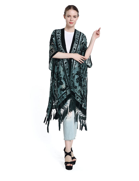 WeHello Women's Burnout Velvet Kimono Long Cardigan Cover Up with Tassel Dark Green Holiday Casual Cardigan Shawl Oversize Tops