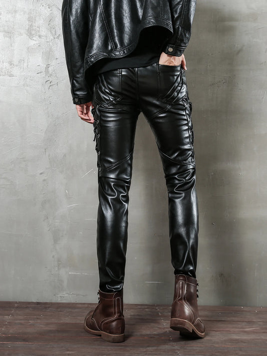 Men`s Motorcycle Rock night club Steampunk Biker Lace Up PU Leather Pants Slim Fit