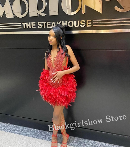 Feather Short Homecoming Party Dress For Black Girls Red Crystal Applique