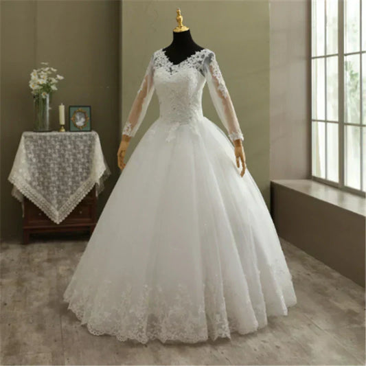 Bridal Ball Gown V Neck Wedding Dress Customized Vestido De Novia Princesa Lace Vintage Long Sleeve Real Image