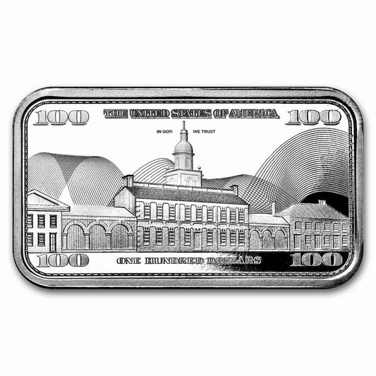 1 oz Silver Bar – Ben Franklin $100 Bill Design