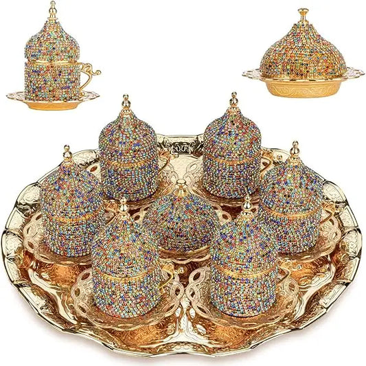 Crystal Embellished Turkish Coffee Set – 27 Pieces – Decorative Zamac Espresso Cups, Saucers and Sugar Bowl with T