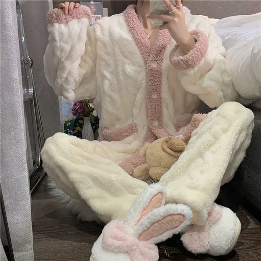 Women's Winter Coral Velvet Pajamas Set Thickened Fluffy O-neck Two-piece Homewear Loungewear Leisure Pajamas for Cold Weather
