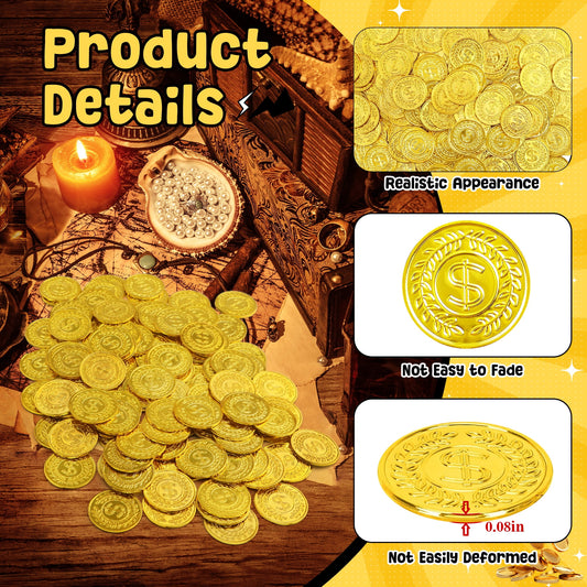 Sinekong 200 pcs Gold Coins, Plastic Gold Coins Bulk, Pirate Treasure for Pirate Party, Treasure Hunt Game, Fake Coins for Classroom Rewards Tokens