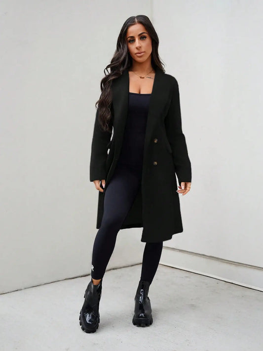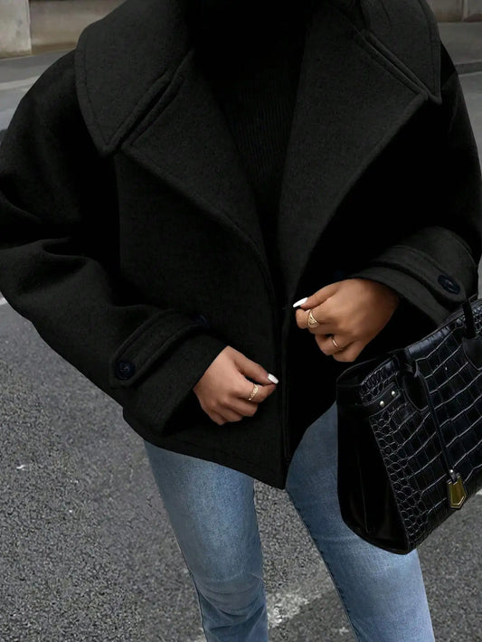 WoMen's Black Double Breasted Wool Blend Jacket With Wide Lapel And Loose Fit