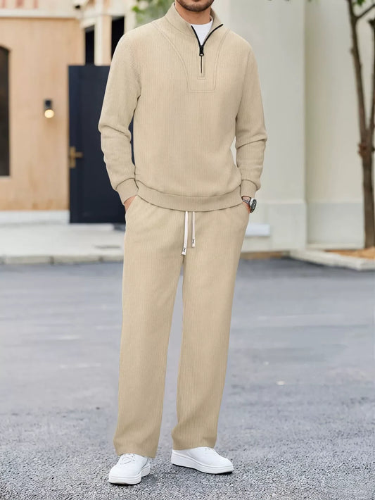 Men's Corduroy Ribbed Texture Half - Zip Set, Casual Stand - Collar Hoodie + Straight - Leg Pants, Top Choice for Daily Outings
