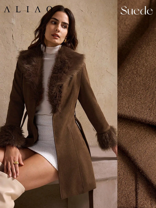 Brown Faux Fur Collar Spliced Leather Coat for Women, Winter Warm Elegant Jacket