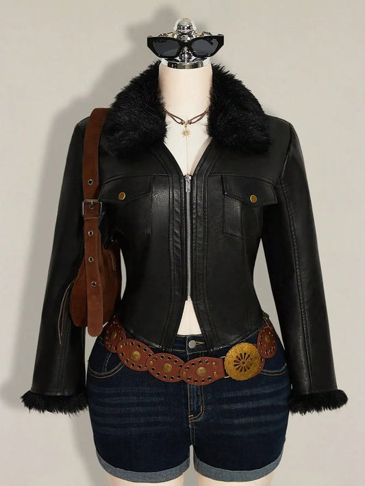Brown PU Leather Moto Jacket with Faux Fur Collar & Cuffs for Women, Plus Size Fall Winter Style