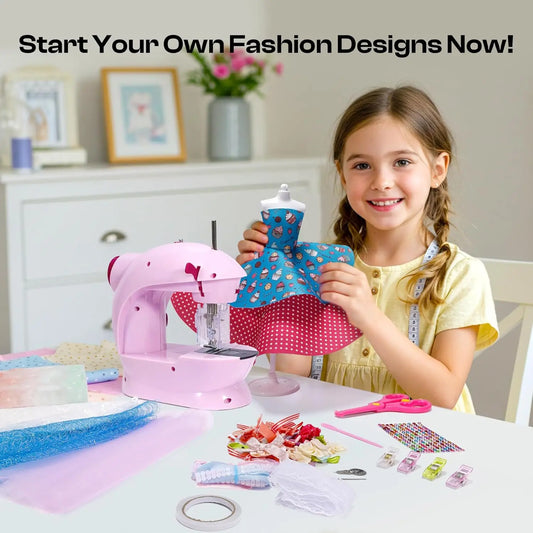 Electric Mini Sewing Machine for Kids with 48PCS Fashion Designer Kits, Mannequins, Fabric & Doll Clothes Accessories