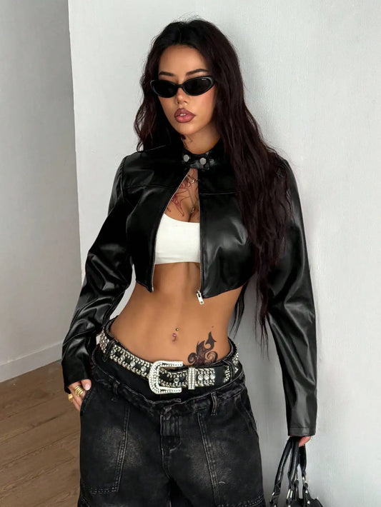 WoMen's Fall/Winter Rave Hippie Basic Leather Comfortable Zip Up Black Slim Fit Crop Long Sleeve Coat,Fall,Fall For Women