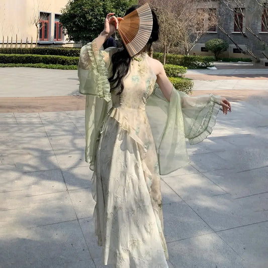 Elegant Green Halterneck Printed Patchwork Irregular Cheongsam Dress with Cardigan WoMen's Sweet Party Dress Vietnamese Dress Es