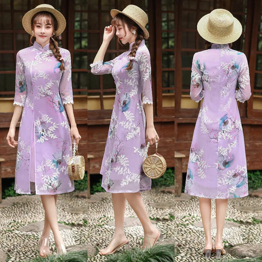 Summer 2023 Mid-length Daily AoDai Cheongsam Improved Modern Vietnam Traditional Dress Slim Elegant Fashion Qipao for Women