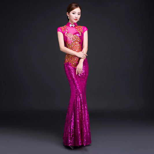 Red Sequin Dress Cheongsam Oriental Womens Wedding Short Sleeve Party Qipao Chinese Style Elegant Long Robe Clothes Vestido