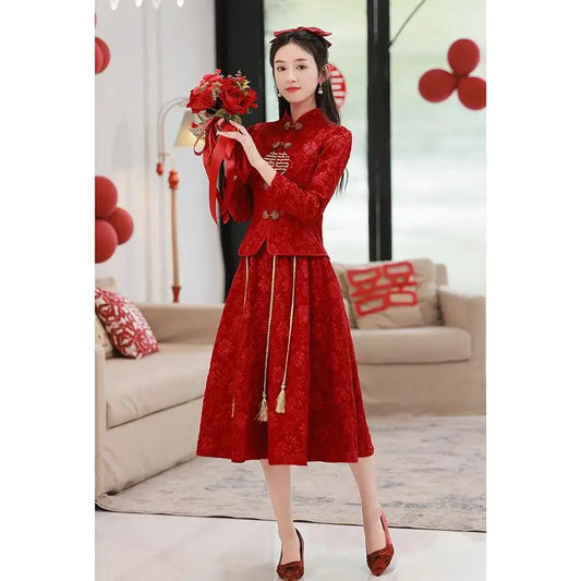 Bridal Burgundy Vintage Improved Simple Qipao Xiuhe Suit Long Sleeve Skirt 2PCS Wedding Dress New Chinese Style Toast Clothes