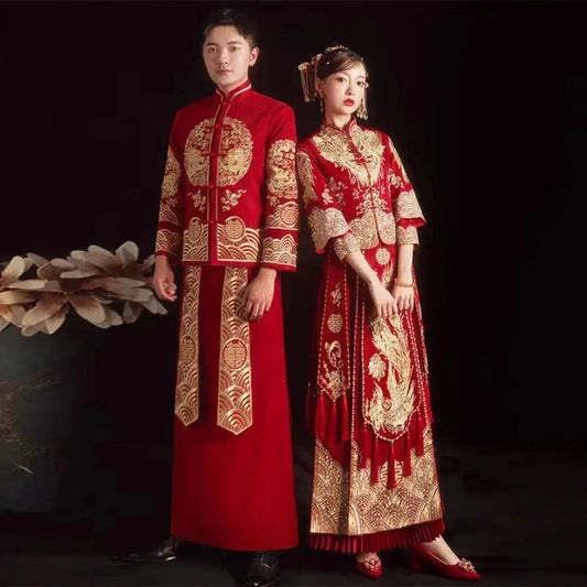 Bride Embroidery Cheongsam Phoenix Clothing Embroidery Qipao for Women and Men Gold Gown Chinese Traditional Wedding Dress