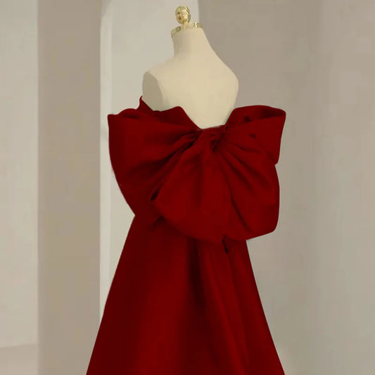 Sexy Strapless Burgundy Wedding Dress Qipao Elegant Back Bow A-Line Maxi Dress Formal Party Dress Sweet Princess Banquet Dress