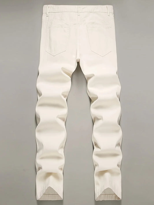 Stylish Mid Stretch Slim Fit Jeans - Men's Mid Waist Distressed And Ripped Denim Jeans With Tassels For All Seasons Street Wear