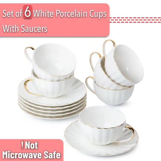 White Tea Cups and Saucers Set of 6 7 oz, Porcelain White Tea Cup Set with Golden Trim Design, Dishwasher Safe, Christmas Gifts