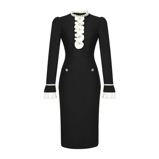 ZYHT 21557 Elegant Korean Party Long Sleeves Formal Slimming Patchwork White Black Solid Spring Long Winter Dress for Women