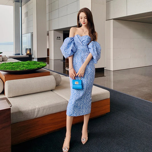 ZYHT 5173 Spring Summer 2025 Women Party Strapless Dresses Fashion Jacquard Sexy Off Shoulder Blue Backless Casual A-Line Dress