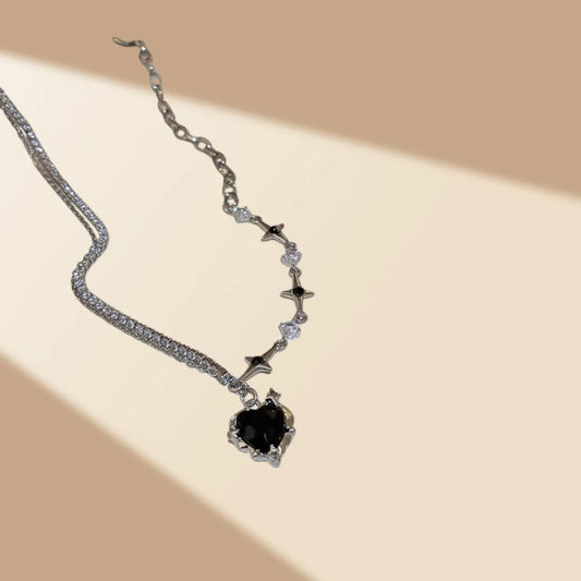 2025 New Silver color Multi-Layer Choker Necklace (One Piece) with Black Heart Star Design - Stylish and Sweet Party Accessory