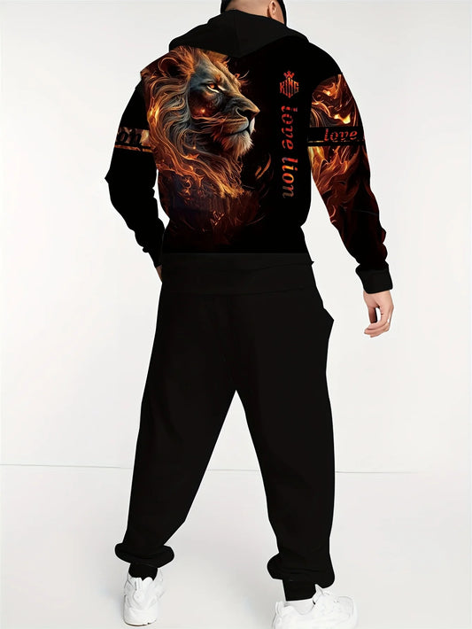 Men's 3D lion print hooded sweatshirt and sweatpants set -100% polyester fiber casual sportswear, hooded long sleeved top and po