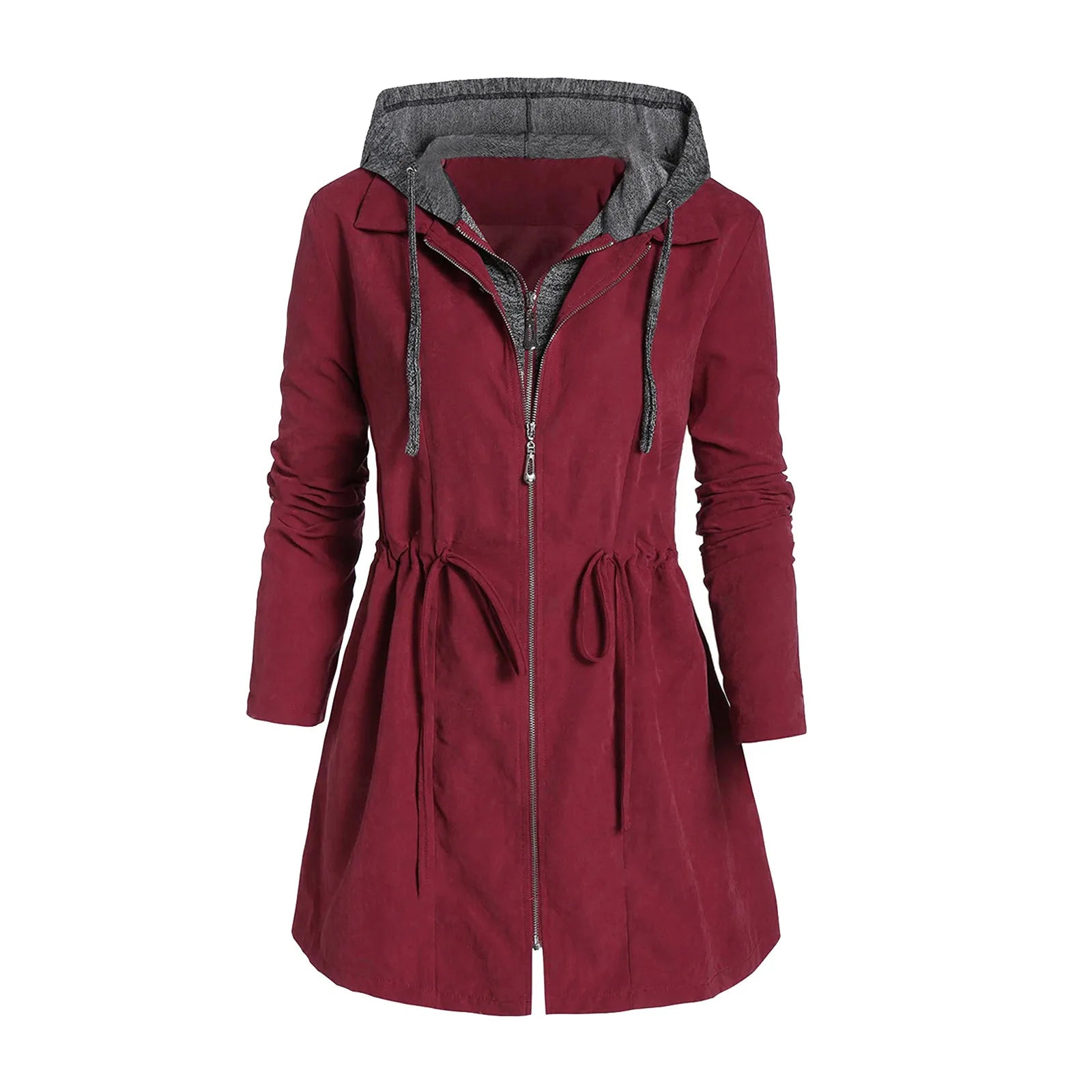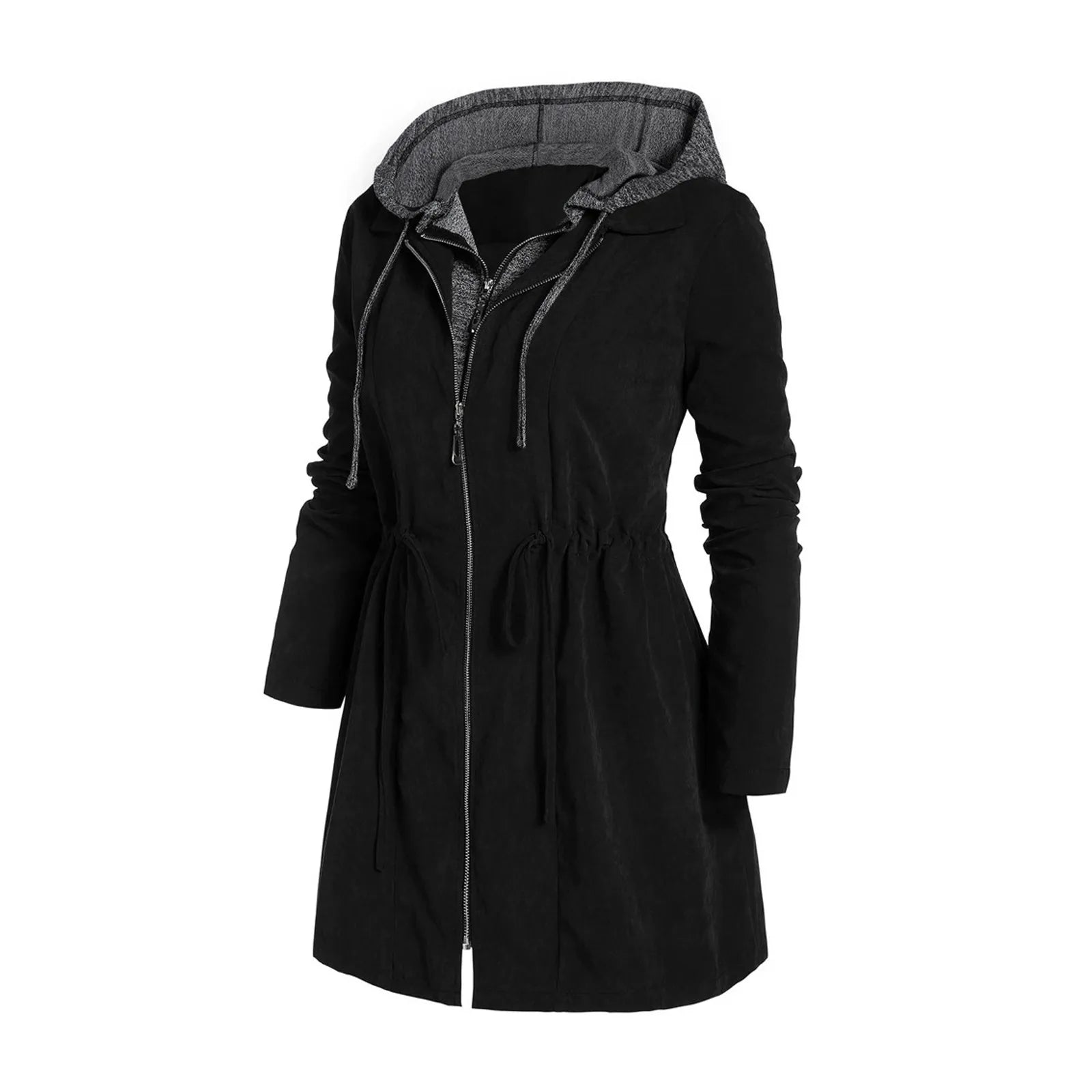 Patchwork Winter Hooded Winter Jackets For Women Plus Size Slimming Waist Drawstring Zipper Up Warm Long Outwear With Pockets